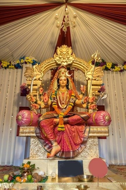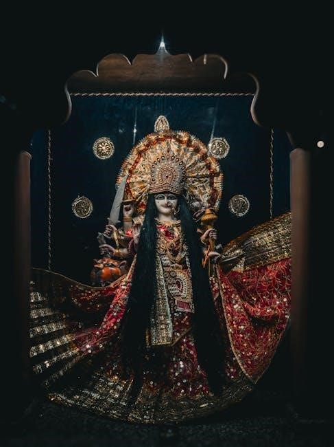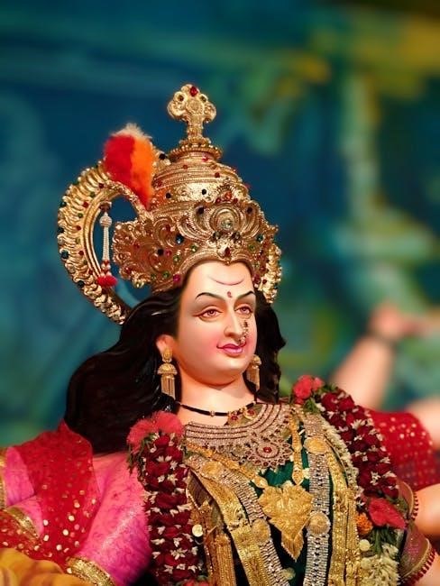 Lalita Devi’s iconography is rich with symbolism, often explained in detail within PDF versions of the Lalita Sahasranama with commentaries. Her red complexion signifies energy and passion, while her four arms represent her all-encompassing power.